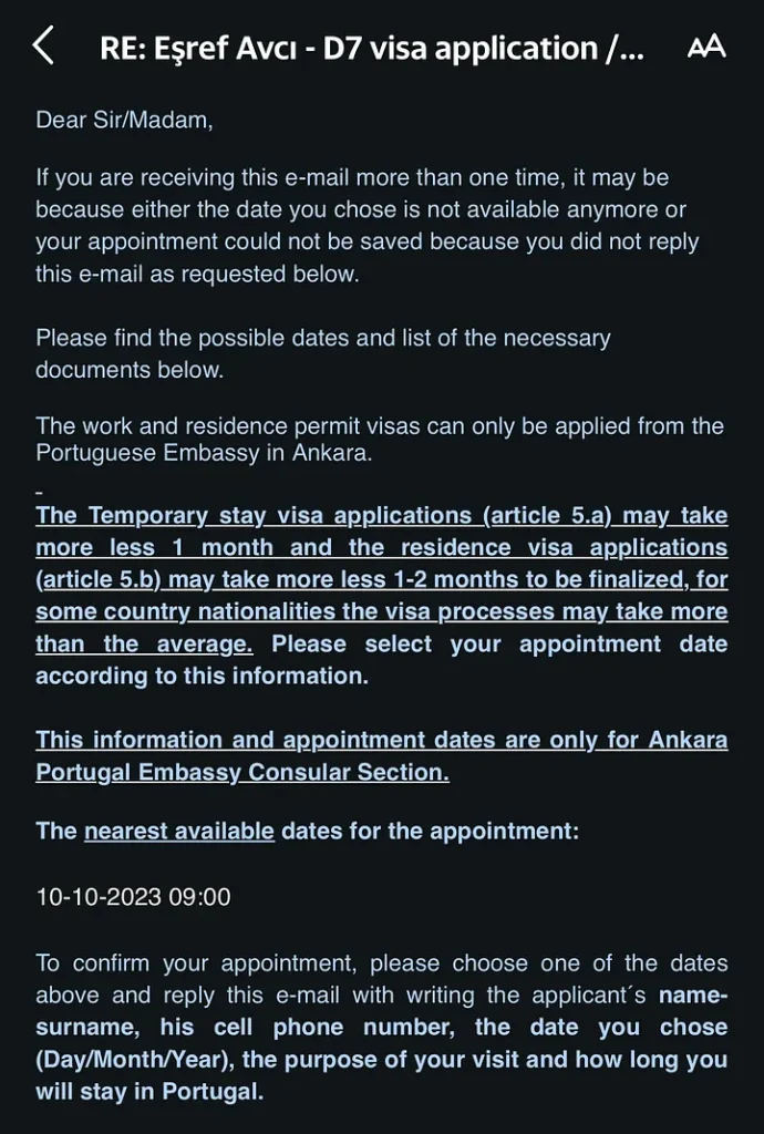 Randevumuzu teyit etmek için bize e-postada belirtilen tarihlerden birini seçmemiz ve e-postayı başvuru sahibi/sahiplerinin adını-soyadını, cep telefonu numarasını, seçtiğimiz tarihi (Gün/Ay/Yıl), ziyaret amacımızı ve Portekiz’de ne kadar kalacağımızı yazarak cevapladık.